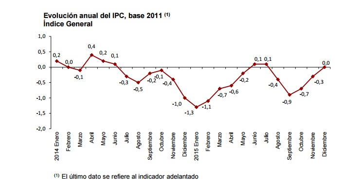 El Índice de Precios de Consumo (IPC) cerró el mes de diciembre en el 0% y elevó tres décimas su tasa interanual respecto al mes anterior, debido al comportamiento de los precios de los carburantes y lubricantes (gasoil y gasolina), que bajaron menos que en 2014, según el indicador adelantado publicado este viernes por el Instituto Nacional de Estadística (INE).