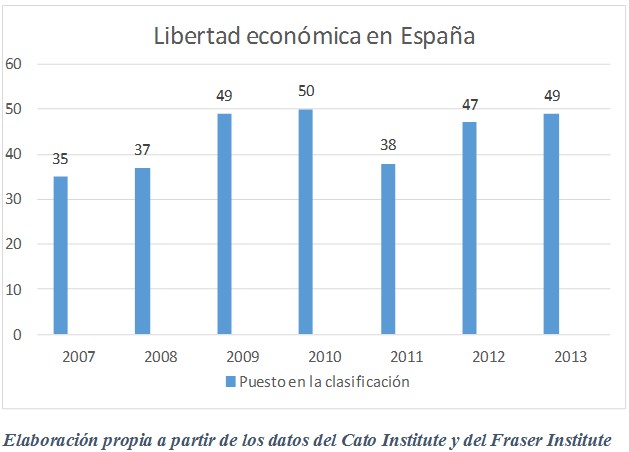 Durante la crisis, son muchos los que, de una u otra forma, han culpado al capitalismo y la excesiva libertad económica de todos los males, cuando es justo al contrario. En el año 2007, cuando estalló la burbuja, España ocupaba el puesto 35 de la clasificación mundial de libertad económica, con una puntuación de 7.55 sobre 10 (clasificación hecha por el Cato Institute y el Fraser Institute, entre otros). Pero según la crisis iba haciéndose más palpable, la libertad económica también iba disminuyendo. En concreto, desde 2007 a 2013 se ha reducido 14 puestos.