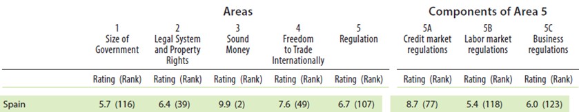 Si analizamos la libertad económica según sus diferentes apartados, podemos hacernos una idea de las reformas que aún debe afrontar el país. España, por ejemplo, tiene mucho que mejorar en cuanto al tamaño del Gobierno (puesto 116 del mundo) y regulación (107), especialmente en materia laboral (118) y actividad empresarial (123).
