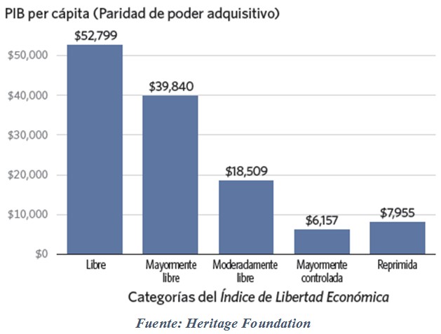 Las economías calificadas como libres o mayormente libres disfrutan de ingresos que duplican o más el promedio del resto de países y quintuplican los de las economías reprimidas.