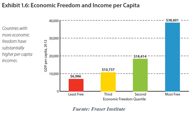 Pero, ¿por qué es tan importante que se avance en materia de libertad económica? Los datos demuestran que a mayor libertad económica, mayor PIB per cápita y mayores ingresos. Existe una relación directa entre libertad y riqueza: a mayor libertad más riqueza, y a menor libertad más pobreza...