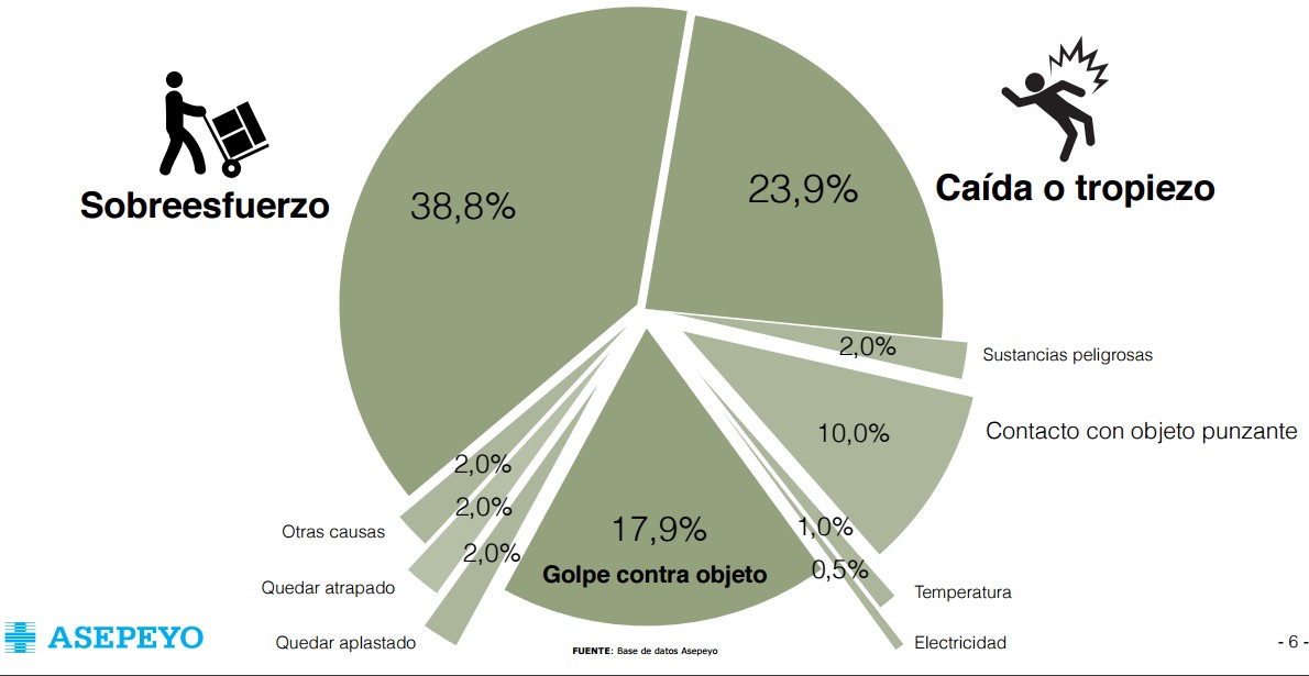 La causa del accidente más habitual fue el sobreesfuerzo, con el 38,8% de los casos, seguida de la caída o el tropiezo, con el 23,9%.