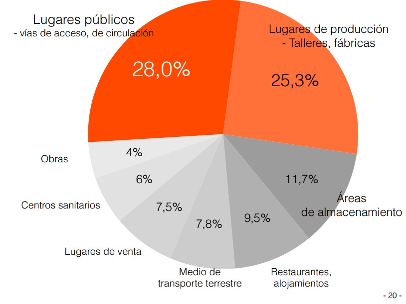 Respecto al lugar del accidente, el 71% se produjo en el centro de trabajo, seguido de lejos por la circunstancia de ir y volver del trabajo (el 12% del total son accidentes de tráfico), con el 14%. En función de la gravedad del accidente, el 99,2% fueron considerados leves.
