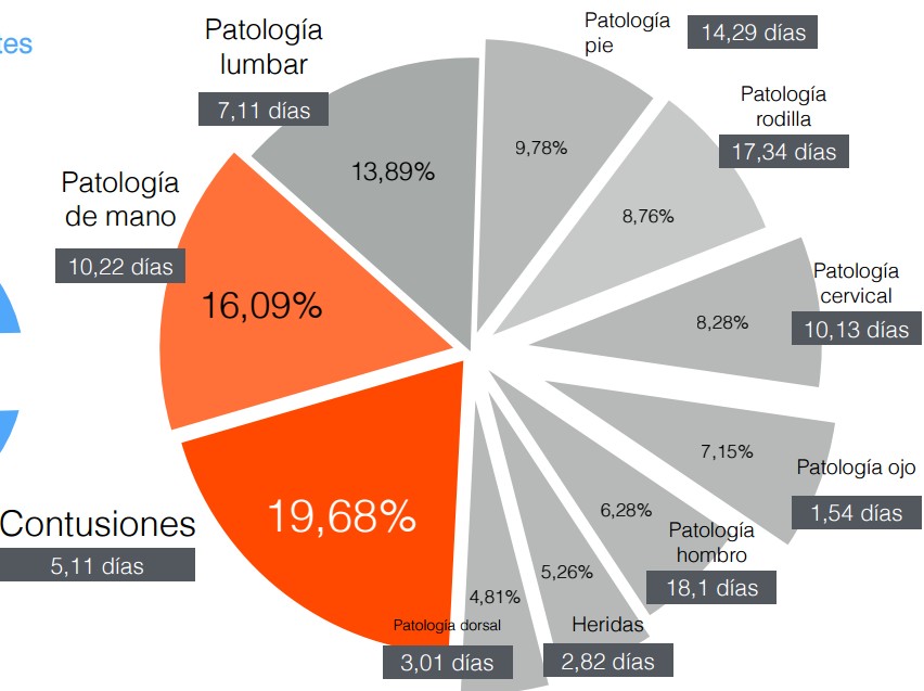 Sobre el tipo de lesión, las dislocaciones, los esguinces y las torceduras copan el 50,69% de los daños. En segundo lugar se encuentran las heridas y lesiones superficiales (27%) y la conmociones y las lesiones internas (10,75%). sin embargo, las patologías de hombro fueron las que más duración media tuvieron.