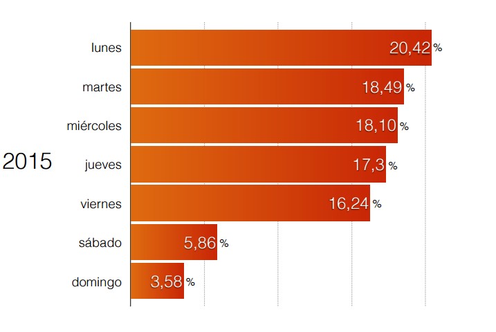 Con el 20,42% de los accidentes, el lunes es el día de la semana que más siniestralidad laboral registra. Además, la segunda hora de la jornada laboral es donde más accidentes se producen.