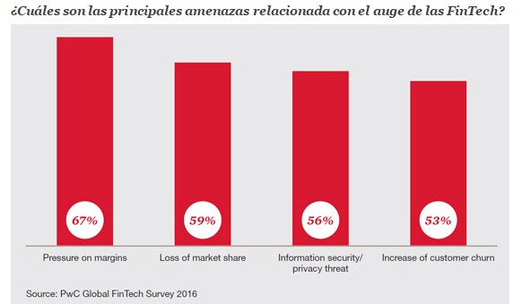 Un 83% afirma que el FinTech está poniendo en riesgo una parte importante del sector, sobre todo en el sector de la banca. Pierden cuota de mercado y no pueden competir ante unos costes tan bajos.