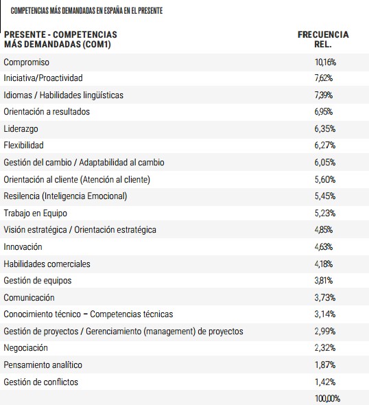 Como se observa en la siguiente tabla, a esta competencia le siguen aquellas relacionadas con la Iniciativa y Proactividad y los Idiomas. Respecto a la Iniciativa y Proactividad, hacen referencia a la "actitud permanente de adelantarse a los demás, a actuar de forma proactiva y no sólo pensar en lo que hay que hacer en el futuro. Implica marcar el rumbo por medio de acciones concretas, no sólo de palabras. Los niveles de actuación van desde concretar decisiones tomadas en el pasado hasta la búsqueda de nuevas oportunidades o soluciones de problemas".