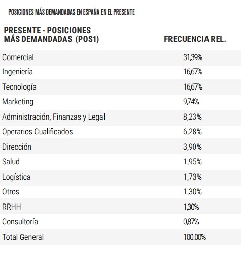 En el año 2015, los responsables de Recursos Humanos, señalaron que las posiciones mas demandadas en la actualidad se concentran en tres familias: Comercial, Ingeniería y Tecnología. Respecto a 2014, los perfiles de Marketing pierden importancia frente a los de Tecnología. La familia que agrupa los perfiles Comerciales se mantiene como la más importante con una clara diferencia respecto las demás. A nivel de familias, las posiciones que obtuvieron menos respuestas fueron las que corresponden a Logística, Recursos Humanos y Consultoría.