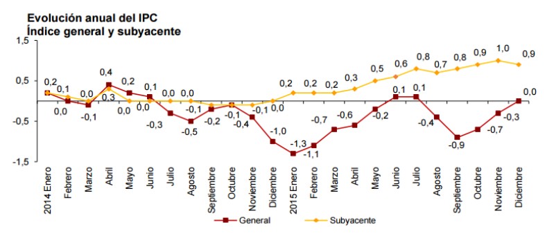 Según los datos del INE, en el año 2015, la variación anual del IPC fue de 0%, sin embargo la tasa de variación anual de la inflación subyacente (índice general sin alimentos no elaborados y productos energéticos) fue del 0,9%, es decir casi un punto por encima del IPC general.