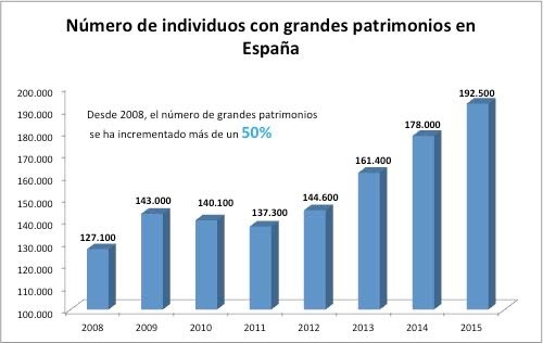 En concreto, el número de ricos en España se situó un total de 193.000 personas en 2015, cuyo patrimonio superó el millón de dólares, una vez excluida la vivienda habitual y los bienes de consumo duradero. Esto supone 15.000 millonarios más que un año antes, tras crecer un 8,4%, el mayor incremento de Europa, por encima de Países Bajos (7,9%), Francia (5,9%) y Alemania (5,6 %), según el informe mundial de la riqueza publicado este jueves por las consultora Capgemini. El número de ricos en Europa subió una media del 4,8% el pasado año. Desde 2008, el número de ricos españoles ha aumentado en un 50%, sumando así 64.500 personas.