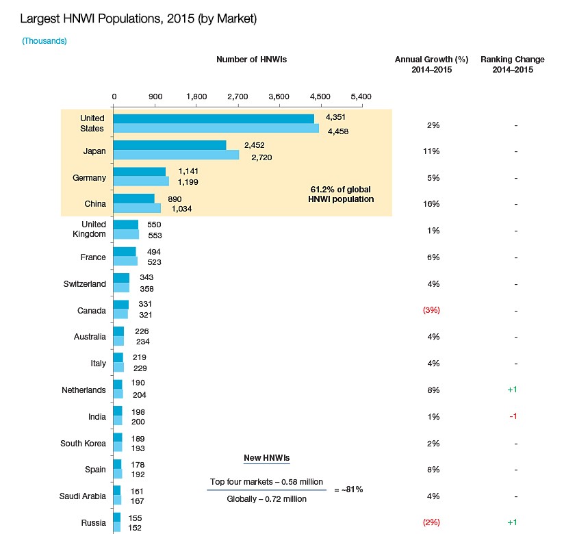 De este modo, España ocupa el puesto decimocuarto en la lista de países más ricos, por detrás de Estados Unidos, Japón, Alemania y China, los tres con mayor número de millonarios y que concentran al 61,2% de población rica mundial.