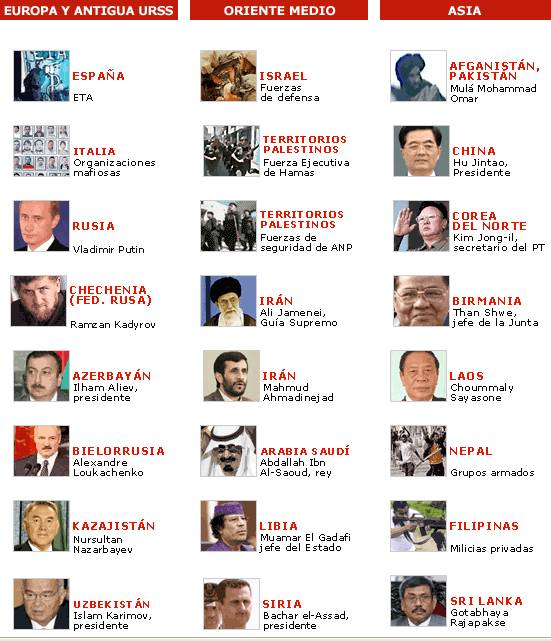 Aquellos a los que "sólo la prensa libre les puede herir" han sido clasificados por la ONG en función de los continentes, en un completo informe en el que desglosan cada una de las acciones que han motivado su inclusión en esta lista del terror.