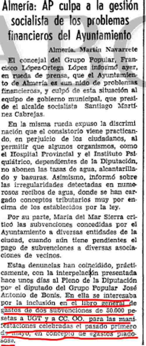 Por ejemplo, y para que nos sonriamos un poco, se contaba en el ABC de Sevilla en el año 1986, 4 de febrero, que el Ayuntamiento de Almería, entonces gobernado por el PSOE, había entregado a la organización sindical 50.000 pesetas de las de entonces para "gastos piadosos". ¿Qué eran esos piadosos acontecimientos? Pues la manifestación del Primero de Mayo de 1985.