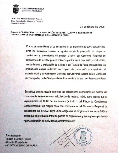 Uno de los argumentos de Frailes, a pesar de este compromiso por escrito de su antecesor en el cargo, es que la subvención que se da al tranvía es tres veces inferior que la del metro ligero a Boadilla del Monte. Pero la Comunidad de Madrid ya ha contestado que el tranvía de Parla es local, y el metro de Boadilla pasa por Pozuelo y llega hasta Madrid.