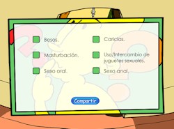 Este recurso interactivo inculca a adolescentes de quince años una sexualidad en la que todo vale y que promociona el sexo ya sea entre chico y chica o entre adolescentes del mismo género. El juego da opción al alumno de elegir lo que quiere hacer con la otra persona y te premia o no según lo que elijas. Estas son las opciones: “besos, masturbación, sexo oral, caricias, uso/intercambio de juguetes sexuales y sexo anal”.