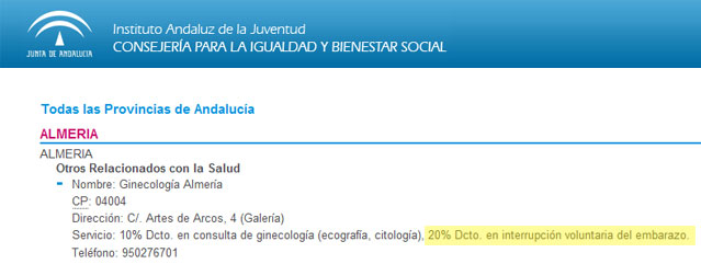 El Instituto Andaluz de la Juventud, dependiente de la Consejería de Igualdad, publica la lista de donde se pueden conseguir estos descuentos. Por ejemplo, en esta clínica sevillana la interesada debe entregar el carné joven y así tendrá un 20 por ciento “en consultas y servicios directos de interrupción voluntaria del embarazo y ecografía, consultas de planificación familiar, revisiones ginecológicas...” Lo mismo ocurre en otra clínica almeriense en la que hace pocas fechas se manifestaron activistas provida.