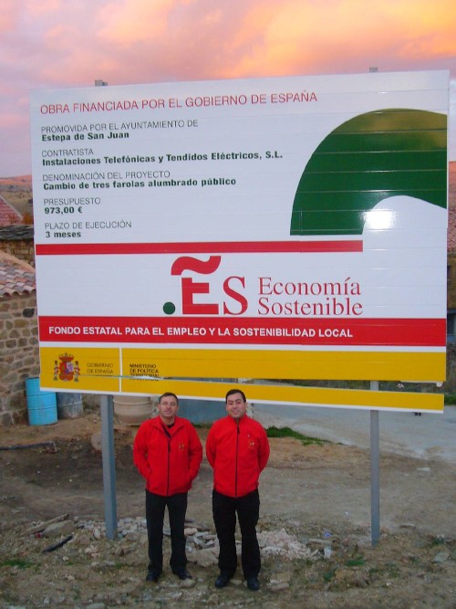 Como muestra el cartelón del Ministerio de Política Territorial que dirige Manuel Chaves, el Gobierno va a destinar 973 euros, dentro del Fondo Estatal para el Empleo y la Sostenibilidad Social, para colocar tres farolas. Los afortunados son los nueve habitantes (6 hombres y 3 mujeres, según Wikipedia) de Estepa de San Juan.