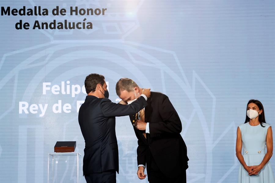 El rey Felipe VI ha sido condecorado este lunes en Sevilla con la primera Medalla de Honor de Andalucía, concedida por el Gobierno de esta comunidad.