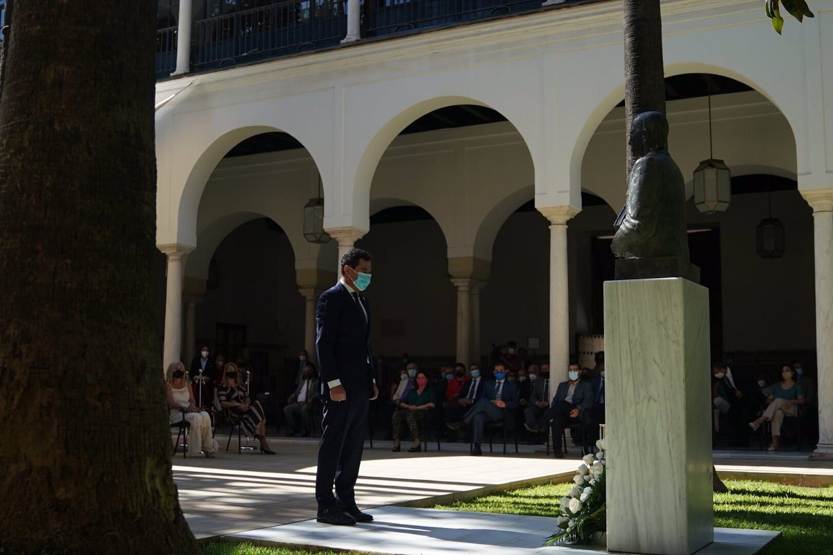El acto se ha celebrado en el Patio del Recibimiento del Parlamento con la participación del presidente de la Junta, Juanma Moreno, y la presidenta del Parlamento, Marta Bosquet, así como de portavoces y representantes de los grupos de la Cámara, salvo Vox, que un año más no se ha sumado a este homenaje a Blas Infante.