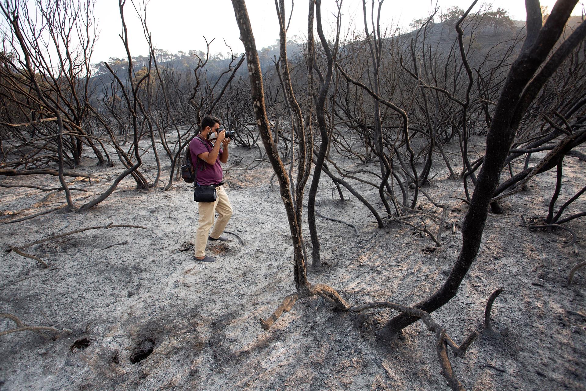 Un fotógrafo toma imágenes de una zona quemada por el incendio forestal en la Sierra Bermeja.