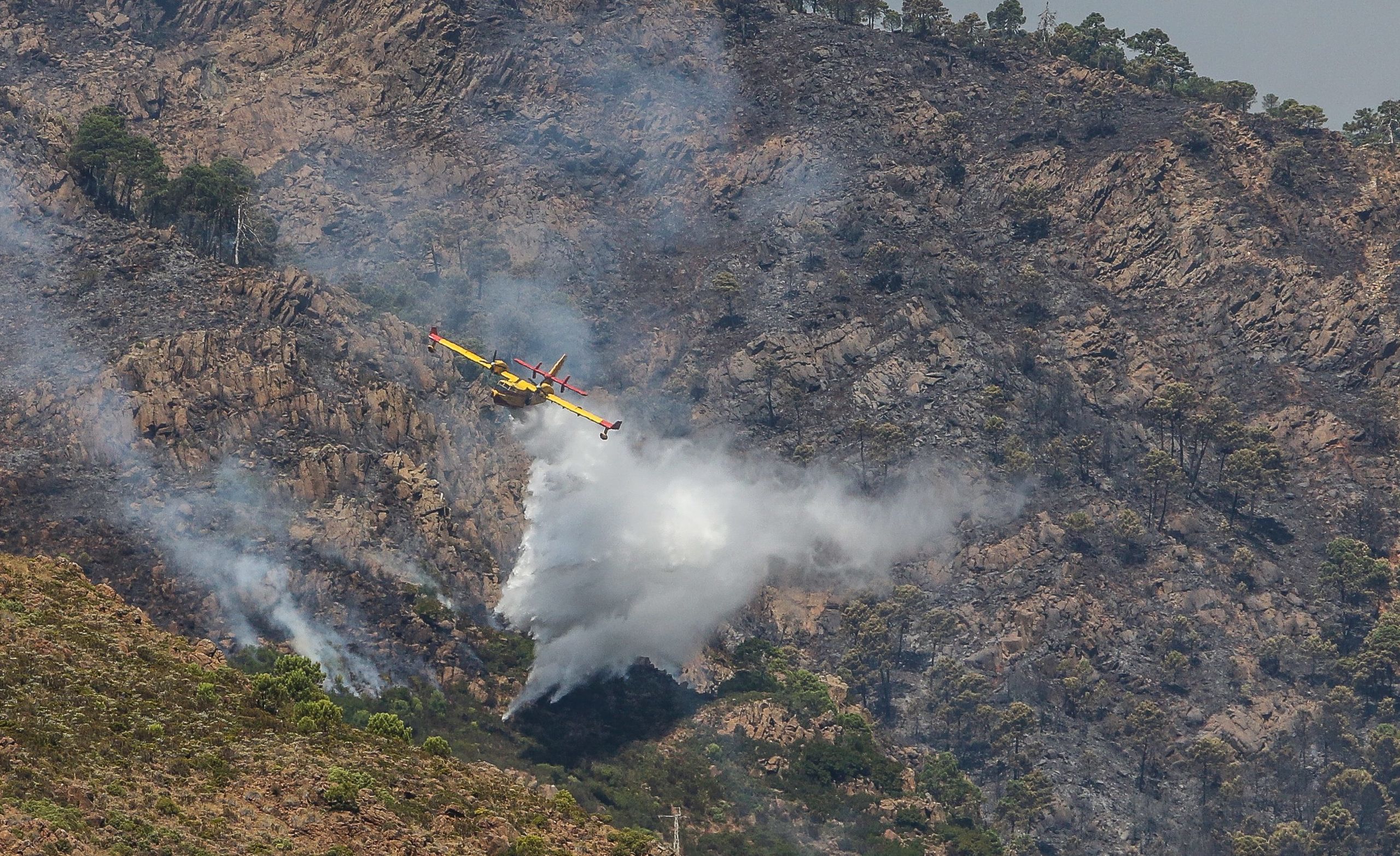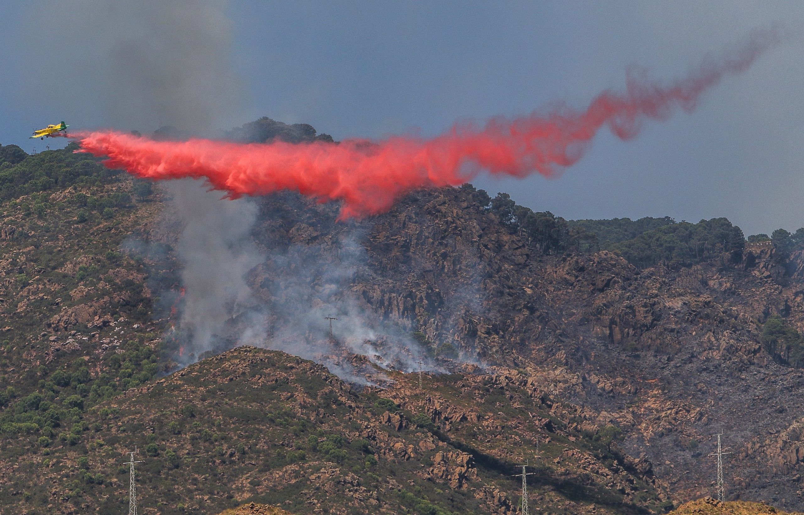Un avión trabaja en la zona efectuando descargas de agua para intentar apagar el fuego de la Sierra Bermeja.