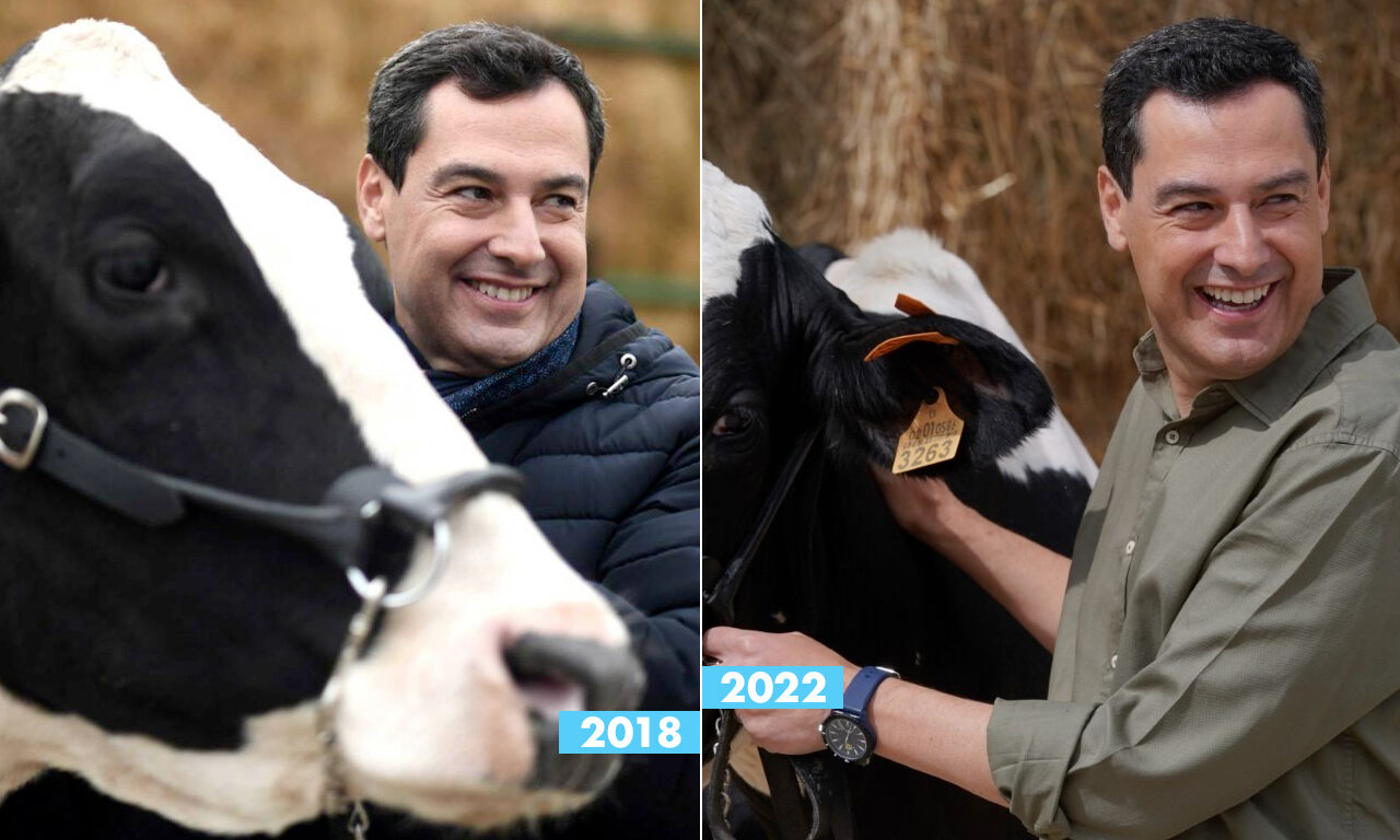 Fadie no es una vaca cualquiera. Además de dar 70 litros de leche, según cuentan sus propietarios, es el animal con el que Juanma Moreno, presidente de la Junta de Andalucía y candidato a la reelección por el PP, protagonizó la foto más destacada en la campaña para las andaluzas de 2018. Fue durante una visita a una ganadería en el Valle de los Pedroches, en Córdoba. Su equipo hacía lo imposible por darle un vuelco a las encuestas que, tras la moción de censura a Rajoy y la llegada de Pablo Casado a Génova, apuntaban al peor resultado de la historia para la formación en Andalucía. Y así fue.