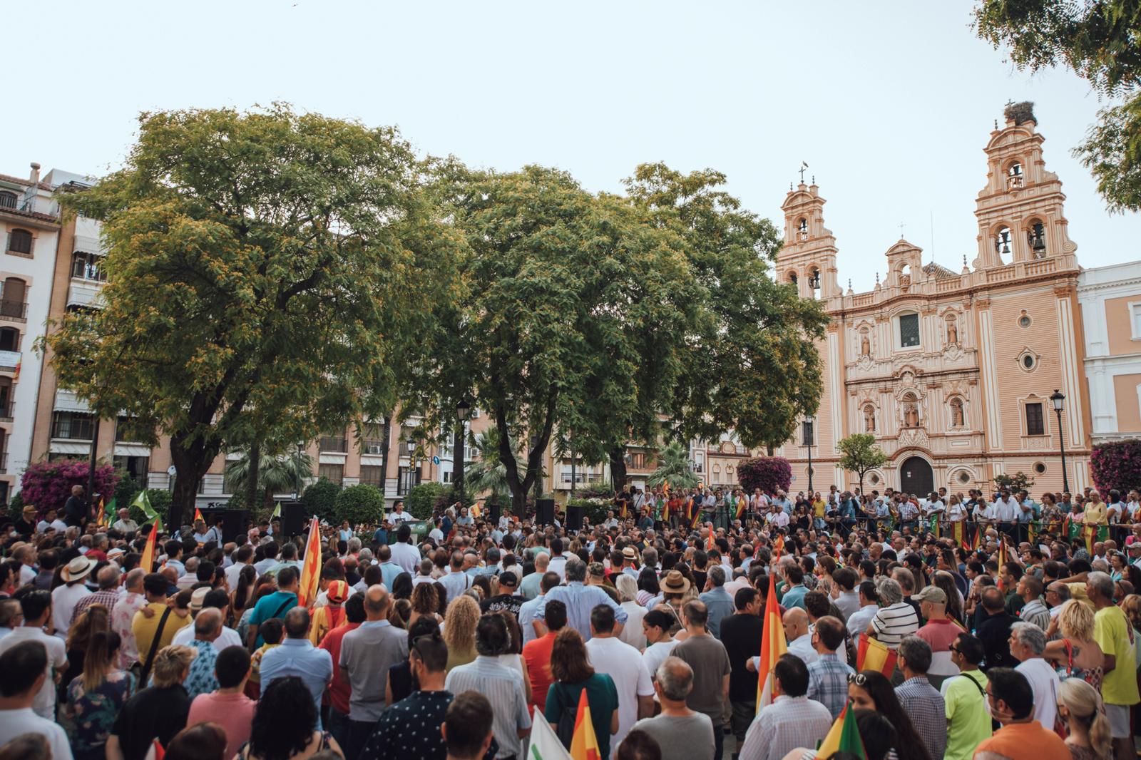 A pesar del asfixiante calor que azota Andalucía en el ecuador de campaña, con el termómetro superando los 40 grados, miles de andaluces abarrotan con su presencia el parque de la Concordia en el que se celebra el mitin. Como en Jaén, Sevilla o Cádiz, Abascal y Olona hacen su aparición estelar juntos para saludar a la marea de personas que espera impaciente su llegada. Un trayecto a pie de apenas diez metros se convierte en un camino casi intransitable por el fervor del público que no les deja avanzar. El regreso será aún peor y se prolongará más de media hora.
