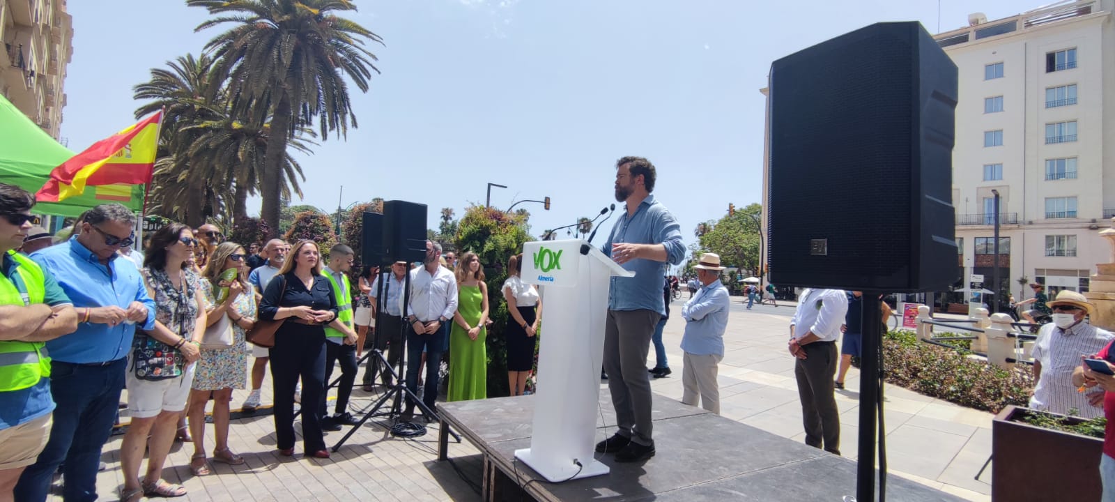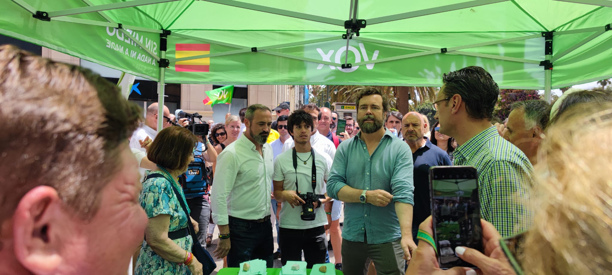 Las altas temperaturas no frenan en cualquier caso a los simpatizantes de Vox. Sus bases son las más movilizadas, como demuestra cada acto al que les convoca el partido. A pesar de ser la una de la tarde y superar los 35 grados, con una sensación térmica de más de 40 por la calima, más de un centenar de personas aguarda impaciente la llegada de Iván Espinosa a la plaza de la Marina de Málaga, importante feudo del PP. A los asistentes al mitin se van sumando poco a poco curiosos que se paran al escuchar a Espinosa hablar de la inmigración y los okupas.