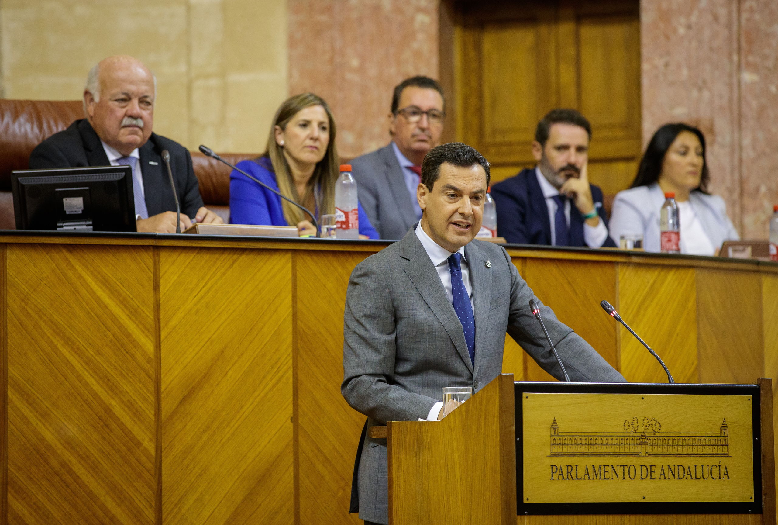 El candidato a la reelección como presidente de la Junta de Andalucía por el PP, Juanma Moreno, se ha dirigido a los diputados electos salidos de las urnas en los comicios del pasado 19 de junio en el Parlamento andaluz en el discurso de investidura de la que será su segunda legislatura en el cargo, la primera vez con un Gobierno monocolor.