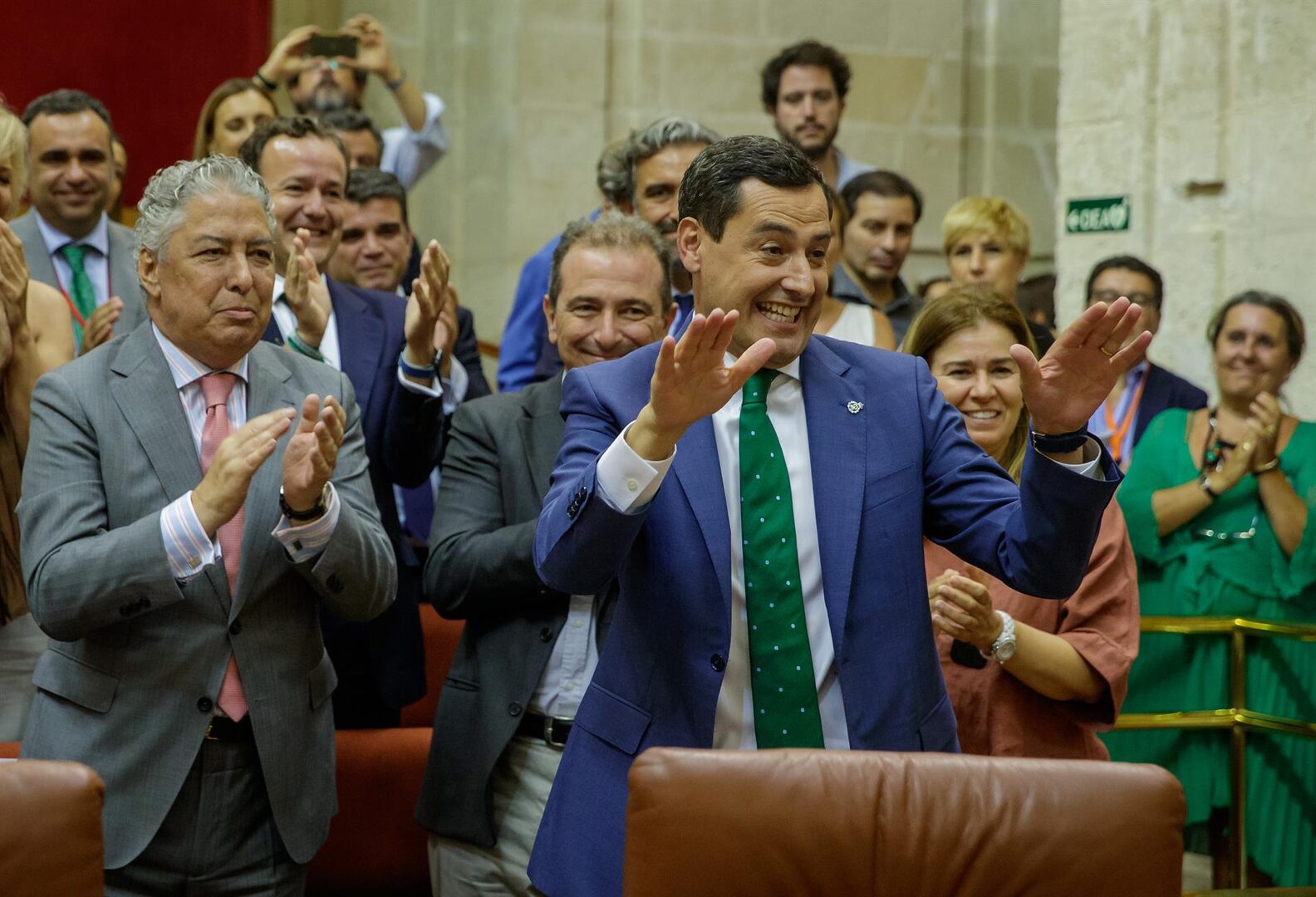 Juanma Moreno ha sido investido este jueves ante el Pleno del Parlamento presidente de la Junta de Andalucía de la XII legislatura, con los votos a favor de los 58 diputados del PP, que cuenta con mayoría absoluta, mientras Vox se ha abstenido de manera "afectuosa". Los otros tres grupos de la oposición, PSOE, 'Por Andalucía' y el mixto-Adelante Andalucía, han votado en contra de la investidura de Moreno (37 en contra).