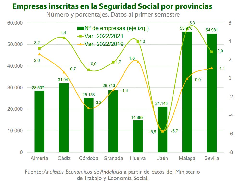 Y, en cuanto al dinamismo económico, se espera que Málaga crezca en el conjunto del 2022 un 5%, la tasa más alta de entre las provincias andaluzas, mientras que, en la primera mitad de año, casi 4 de cada 10 sociedades constituidas en la Comunidad lo han hecho en Málaga. En total, según el último barómetro del Colegio de Economista de Málaga, la provincia cuenta 55.978 empresas registradas en la Seguridad Social, el mayor número de Andalucía.