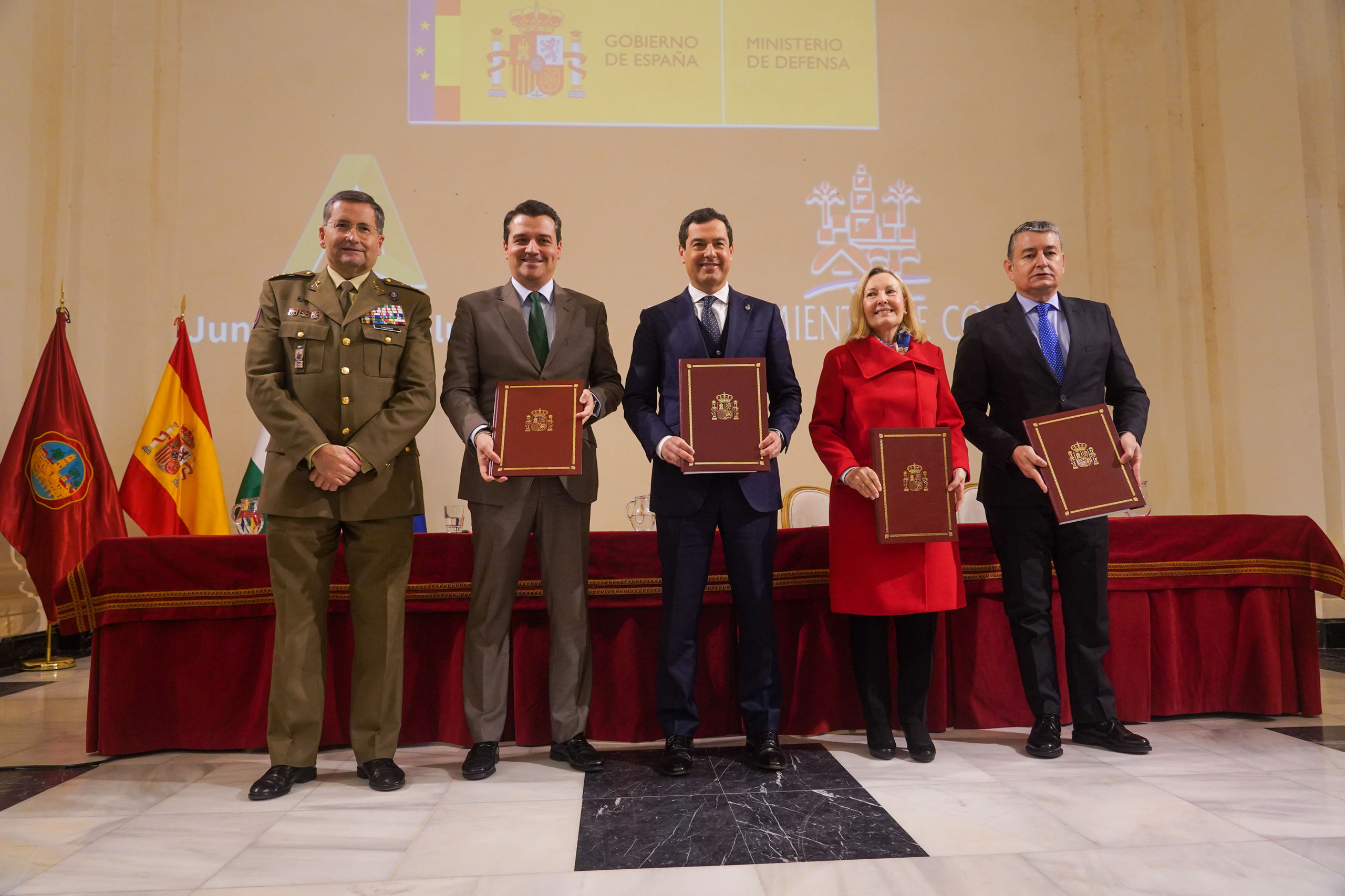 El proyecto de Base Logística del Ejército de Tierra 'General del Ejército Javier Varela’ que se creará en Córdoba ha dado un importante paso adelante con la firma del convenio económico entre la Junta de Andalucía, el Gobierno de España, representado por el ministerio de Defensa, y el Ayuntamiento de Córdoba. El acto, celebrado en la subdelegación de Defensa en la ciudad, has estado presidido por el presidente andaluz, Juanma Moreno.