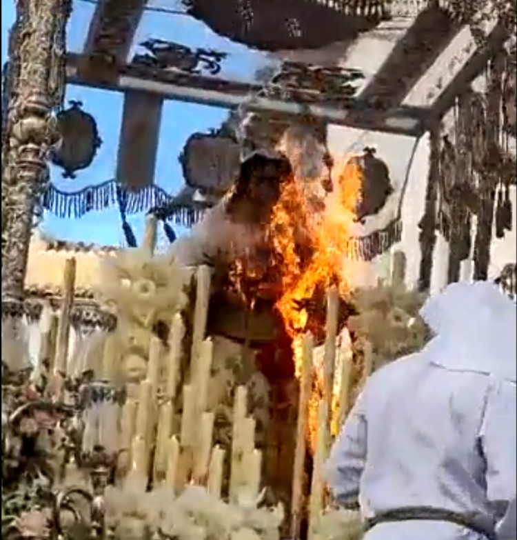 Una imagen de la Virgen del Rocío ha salido ardiendo este Domingo de Ramos en la localidad de Vélez-Málaga (Málaga) mientras estaba en procesión por las calles del municipio tras caerse uno de los cirios que conforman la candelería contra la saya de la imagen. El suceso se produjo minutos antes de las 18:00 horas, a unos 200 metros de su salida procesional, según relataron a Efe testigos presenciales.