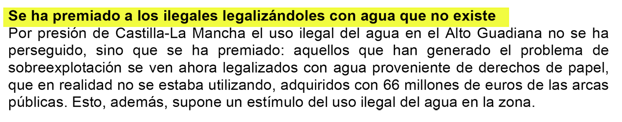 Su denuncia coincide con las durísimas acusaciones que WWF lanzó en 2012 en un informe titulado "El fiasco del agua en el Alto Guadiana". En él, se llegaba a la conclusión de que "no se ha conseguido el ahorro de agua deseado", ya que "el 83% de las explotaciones cuyos derechos fueron comprados no extraían agua al menos durante los 5 años previos a la venta", el 95% de las compras se hicieron "fuera de las zonas prioritarias" y, sin embargo, el volumen adquirido se habría destinado a "legalizar pozos ilegales dentro del acuífero 23 o Mancha Occidental, provocando así el efecto contrario al perseguido". De esta forma, agricultores y ecologistas denuncian que se habría incumplido el requisito de destinar el 70% a la recuperación ambiental, dando lugar a "una clara maniobra política financiada con dinero público para obtener votos", tal y como pone de manifiesto la querella presentada por la Comunidad de Usuarios Rus-Valdelobos.