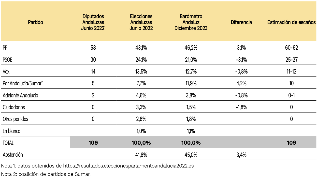 Respecto al Barómetro Andaluz de septiembre de 2023 el PP de Moreno ha mejorado cinco puntos. En ese sondeo los populares cayeron hasta el 41,4% de los votos y perderían 2 diputados quedándose en 56; Vox dejaría de ser la tercera fuerza en la región en favor de la coalición de extrema izquierda Por Andalucía y el PSOE cogería algo de aire llegando a los 32 escaños. En los meses transcurridos entre ambos sondeos la situación económica, los pactos de investidura de Pedro Sánchez con los golpistas catalanes, los nacionalistas vascos y con Bildu han hecho mella en los votantes socialistas.