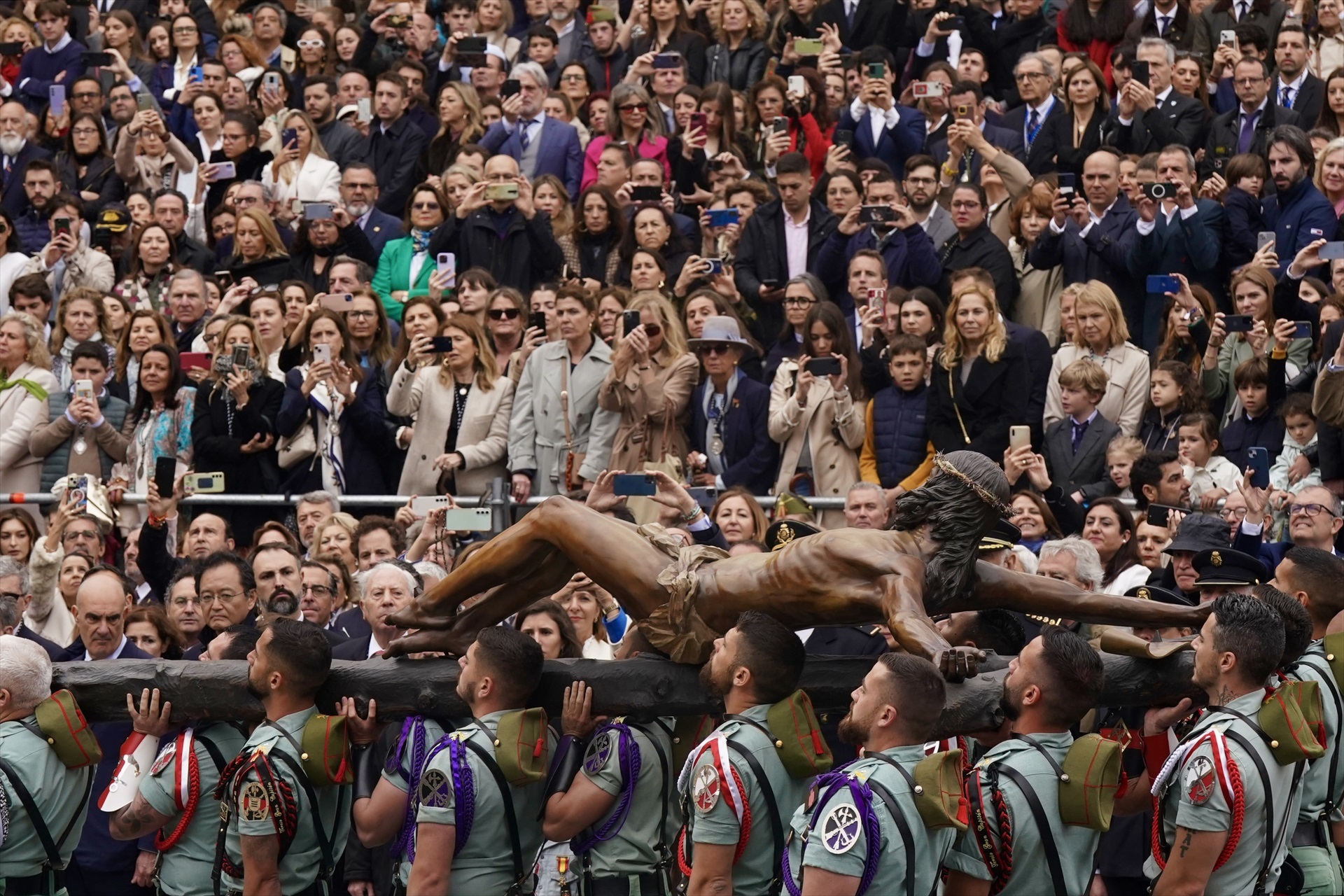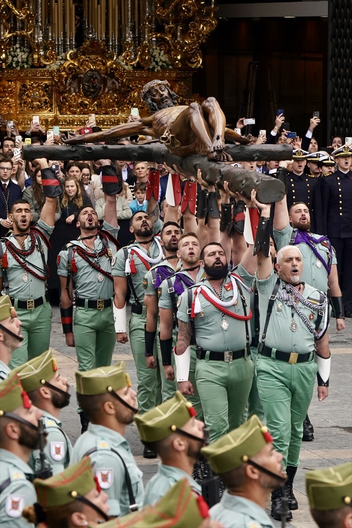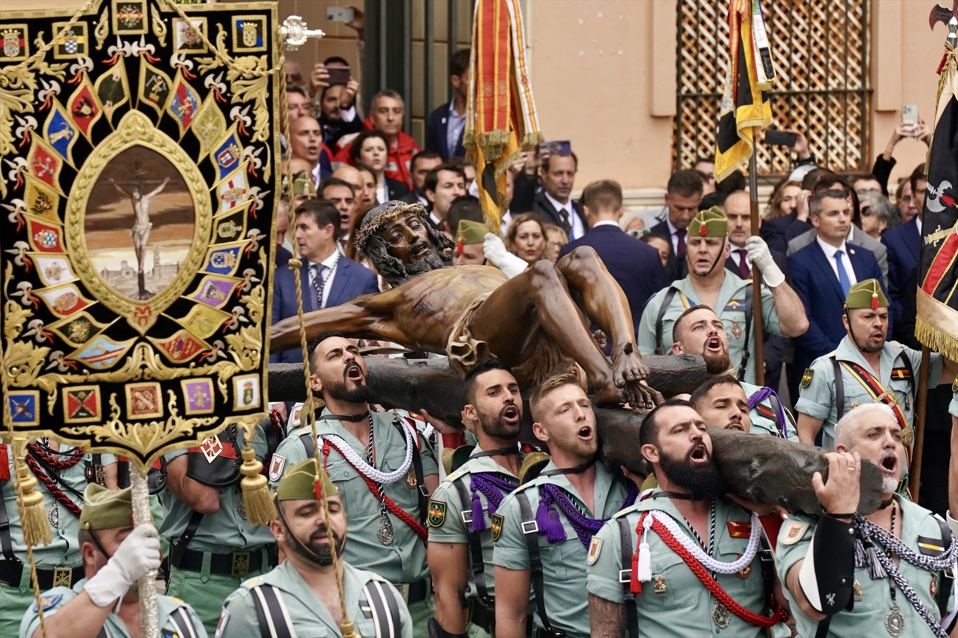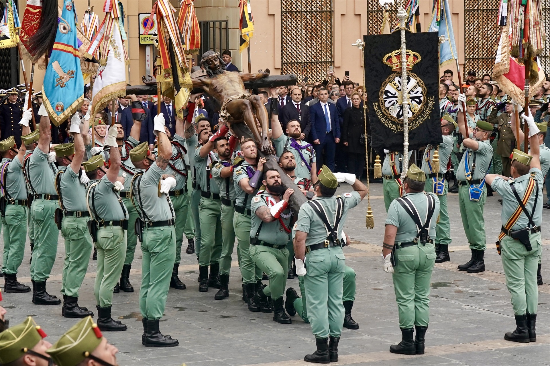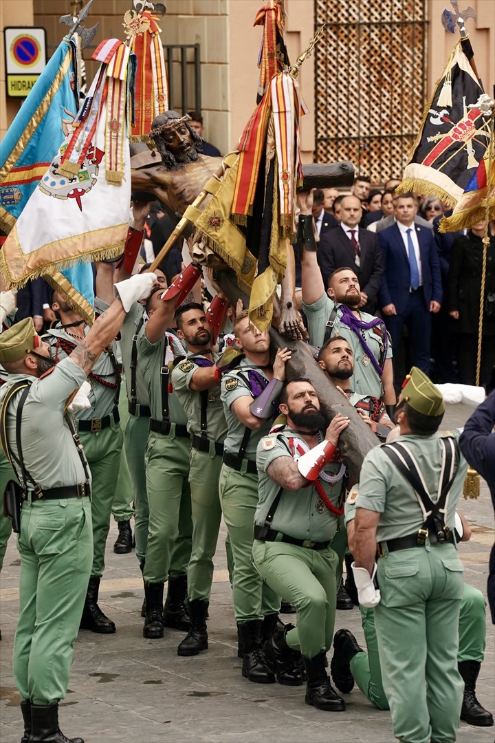 La misión de los legionarios ha culminado minutos antes de las 13:00 horas con la elevación, mediante un sistema de poleas, del Cristo de la Buena Muerte para su colocación vertical en el trono, que pesa 2.650 kilos.