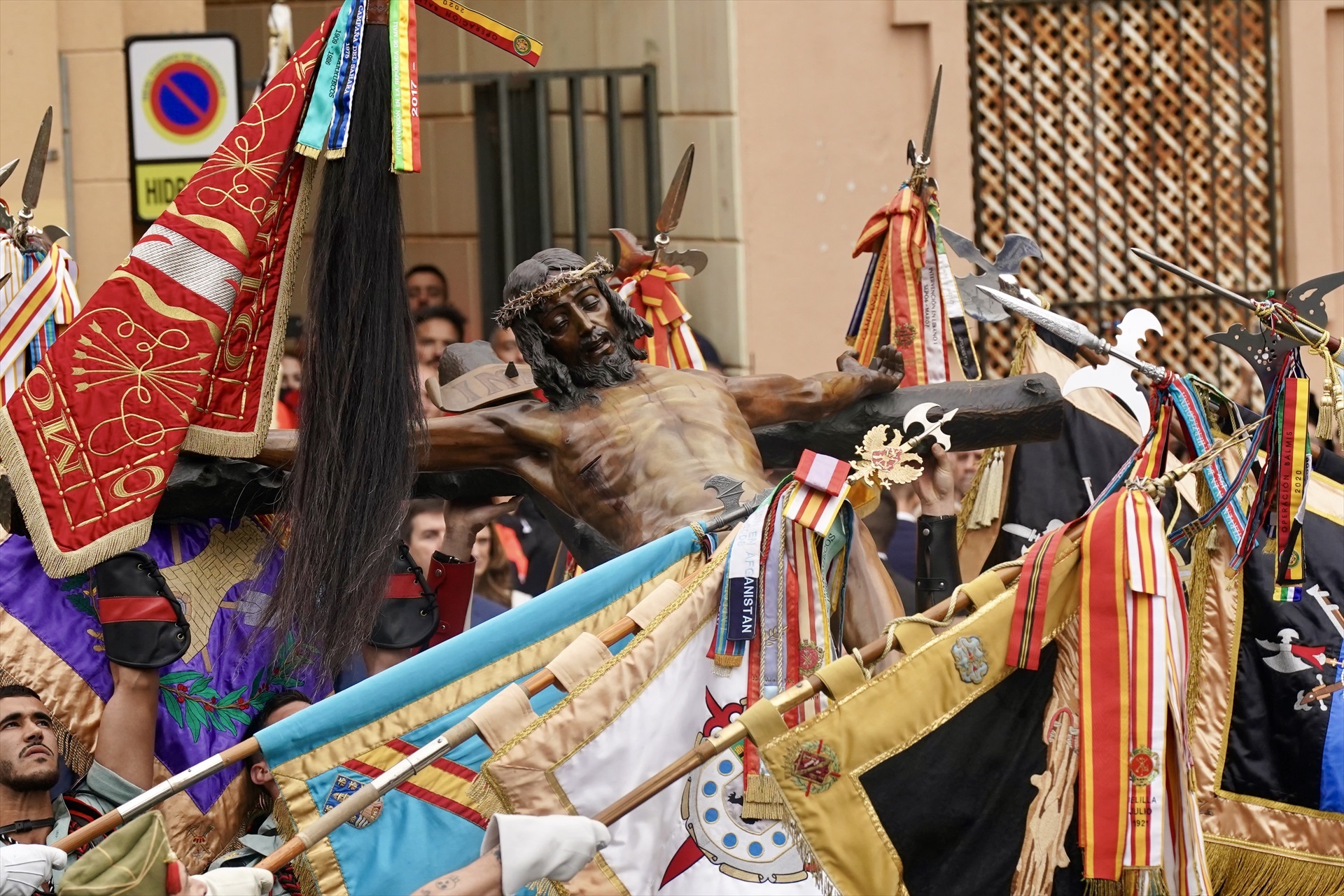 La lluvia ha dado una tregua y la ceremonia se ha podido desarrollar sin incidencias. Primero ha tenido lugar el relevo del estandarte del Cristo de la Buena Muerte y Ánimas y seguidamente ha comenzado el solemne traslado de la imagen a hombros de los legionarios desde la iglesia de Santo Domingo hasta su trono.