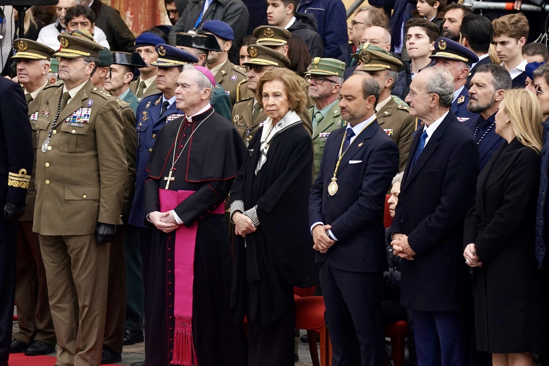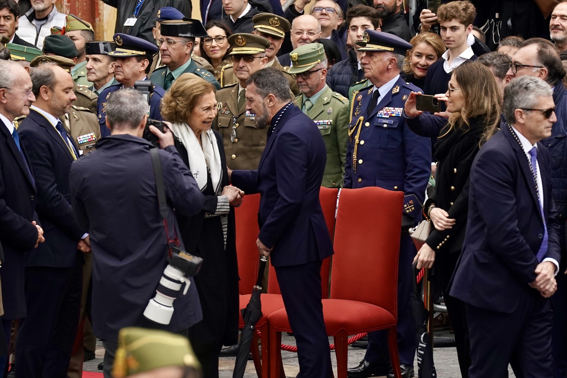 Los legionarios han entonado el himno El novio de la muerte durante las maniobras de aproximación al dique de Levante, donde les esperaban doña Sofía y su hermana, Irene de Grecia, acompañadas por el alcalde de Málaga, Francisco de la Torre; la consejera de Economía, Hacienda y Fondos Europeos, Carolina España, y el Jefe de Estado Mayor del Ejército de Tierra (JEME), General Amador Enseñat y Berea, entre otras autoridades militares, civiles y religiosas.