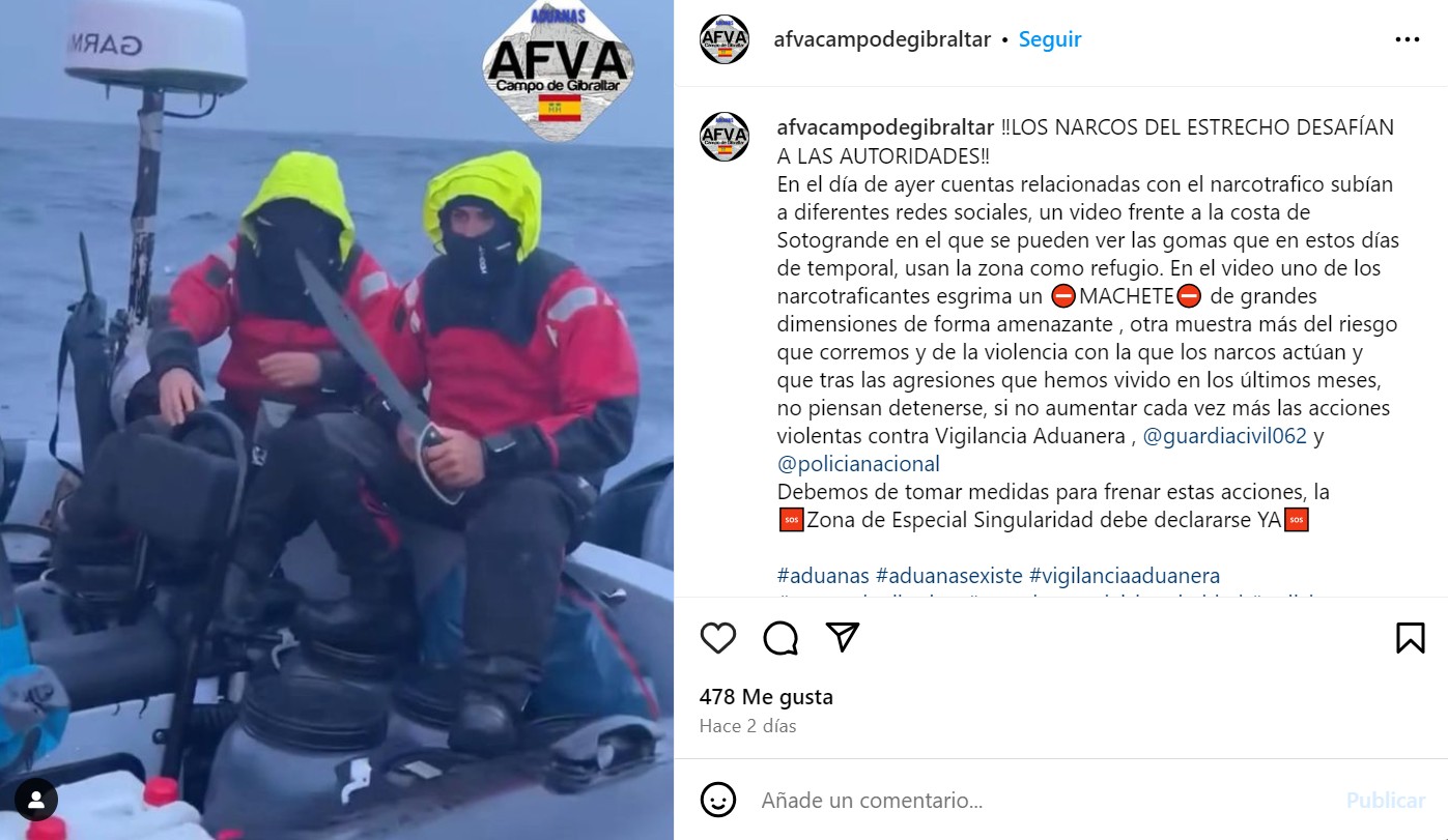 El último símbolo de ese envalentonamiento se ha podido ver durante el último fin de semana a través de las redes sociales, donde varias cuentas asociadas a los clanes del narcotráfico han publicado imágenes de narcotraficantes a bordo de lanchas rápidas portando machetes de grandes dimensiones, con el objetivo de intimidad e, incluso, agredir si fuera necesario a los agentes de las fuerzas del orden.