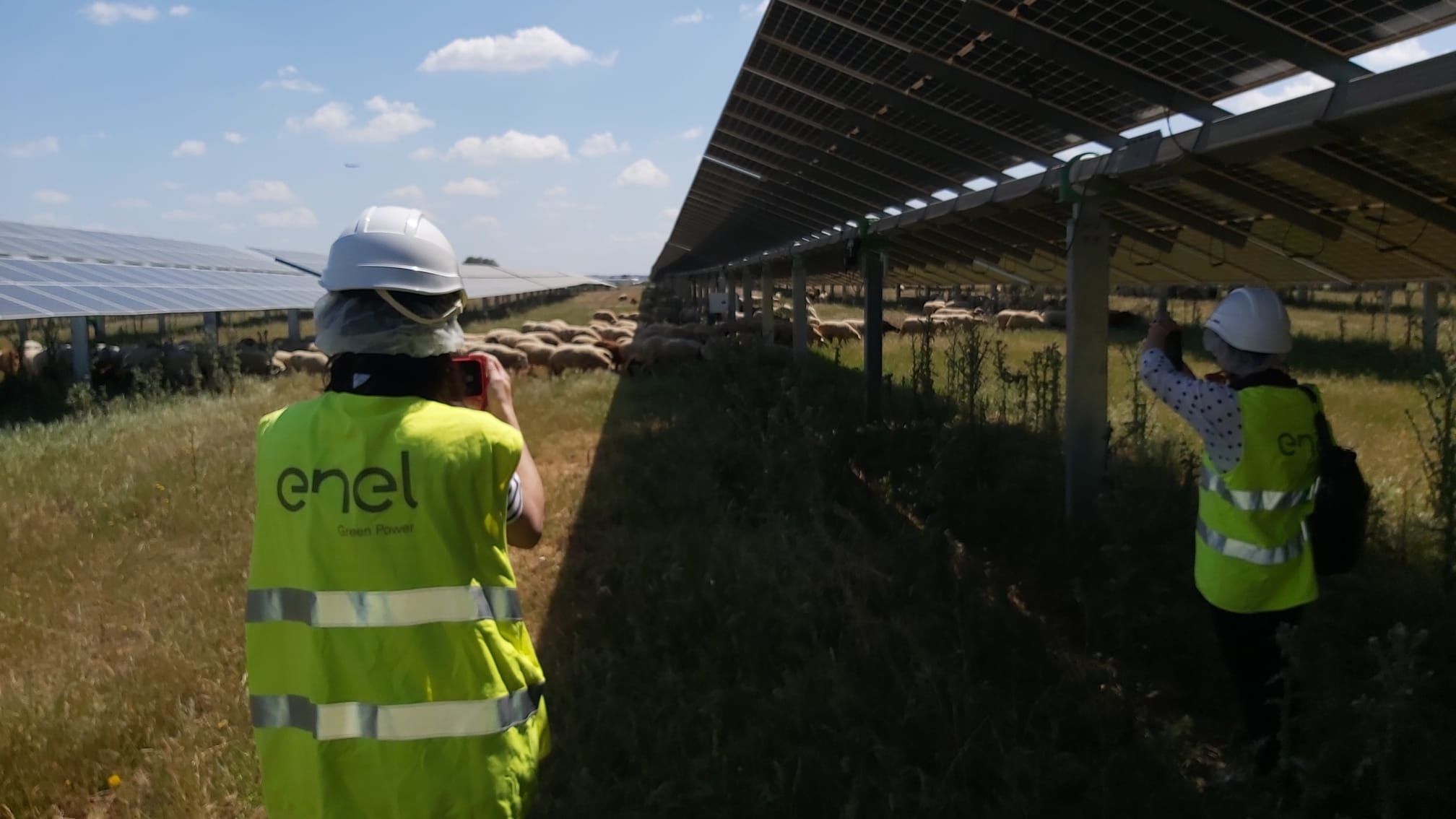 Entre los municipios de Carmona y La Rinconada, los periodistas pudieron además observar un ejemplo de solar agrovoltaica, Las Corchas / Los Naranjos, de Enel Green Power España. Se trata de dos plantas fotovoltaicas de 100 MW que generan 202 GWh al año, capaces de cubrir el consumo energético anual de 25.500 hogares y cuyo suelo comparten con el sector primario. Cuentan con 258.120 paneles fotovoltaicos bifaciales que captan la radiación solar por ambas caras para un aprovechamiento óptimo.