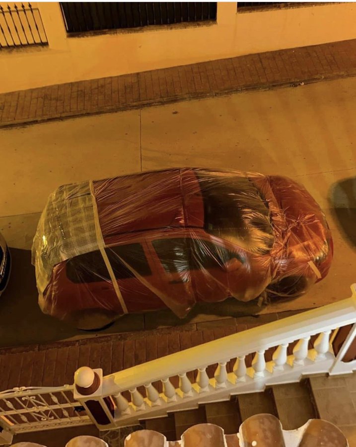 Ante el riesgo naranja activado por la Agencia Estatal de Meteorología (AEMET), la gente ha reaccionado para protegerse de las posibles inundaciones tras el aviso de alerta roja, y han precintado los coches con plásticos, unas imágenes que han circulado en redes sociales y han llamado la atención de los usuarios.