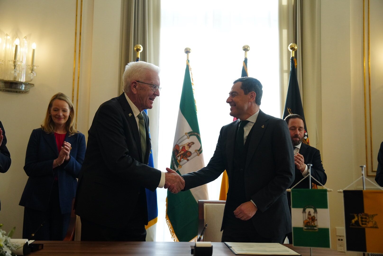 El acuerdo, que avanza el que se alcanzó en octubre del año pasado, se ha firmado este jueves en Stuttgart (Alemania), y ha contado con la presencia del presidente de la Junta, Juanma Moreno, y el ministro-presidente del Land alemán, Winfried Kretschmann. El objetivo último de ambos convenios es la lucha contra el cambio climático y el desarrollo de las energías verdes. Además de los jefes de Gobierno regional, han acudido al posterior encuentro bilateral el consejero de Industria, Energía y Minas, Jorge Paradela, y la ministra de Medio Ambiente, Protección Clima y Sector Energía, Thekla Walker.