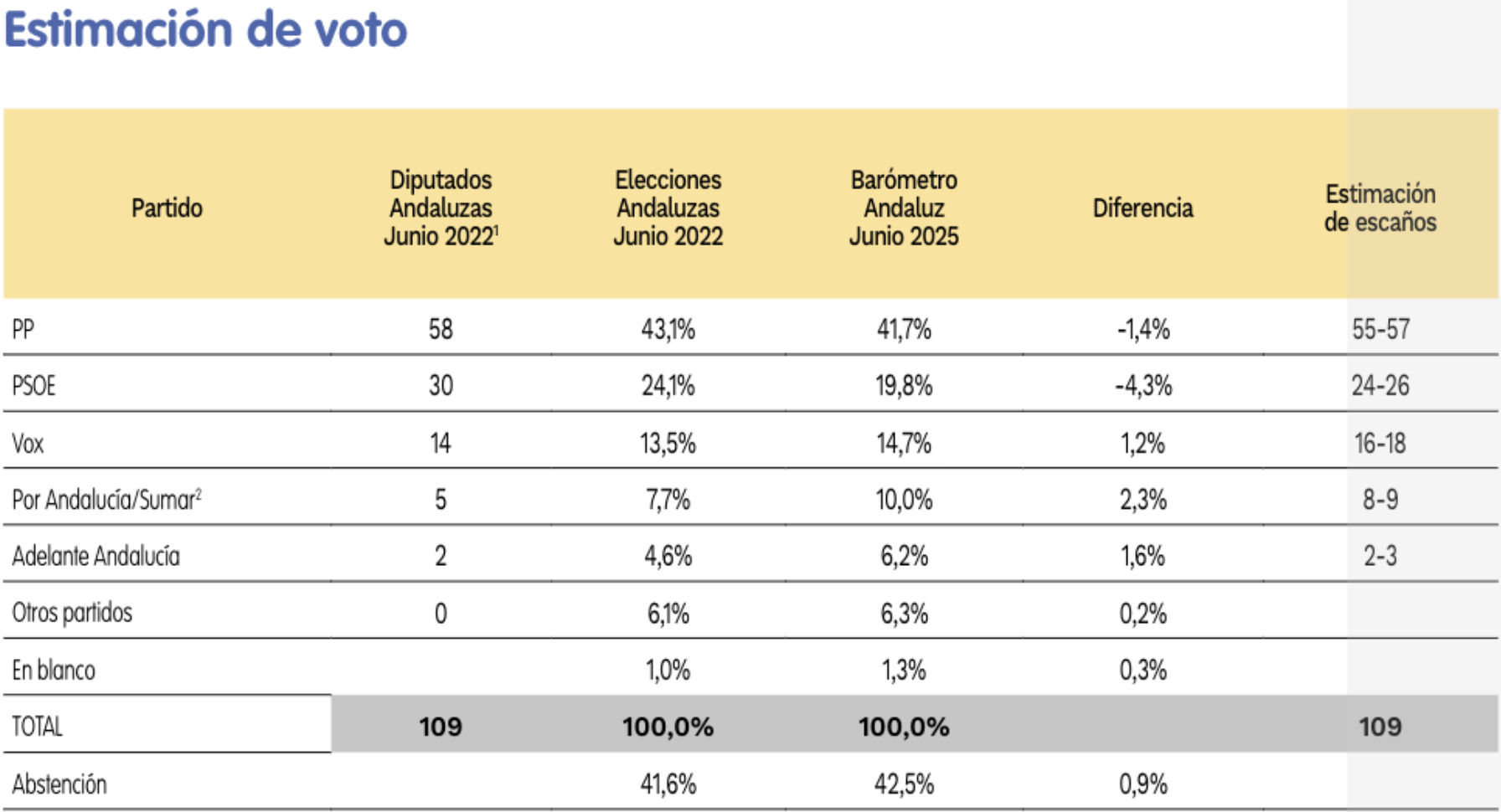 El hundimiento del PSOE dejaría a los socialistas casi 22 puntos (21,9) por debajo del PP-A de Juanma Moreno. Sin embargo, aunque los populares mantendrían la mayoría absoluta, el desgaste de dos legislaturas hace mella en Moreno que se dejaría un 1,4% del voto y entre uno y tres escaños en el Parlamento de Andalucía de los 58 con los que cuenta actualmente.