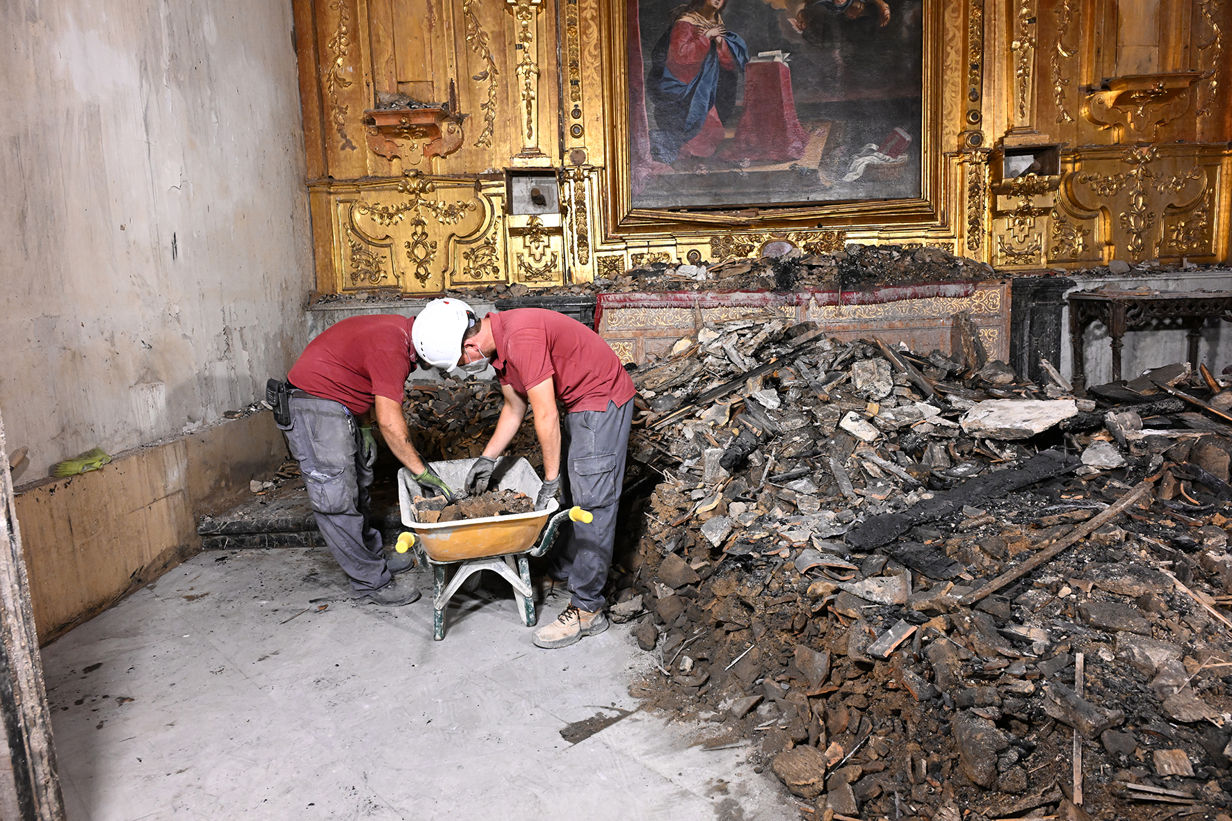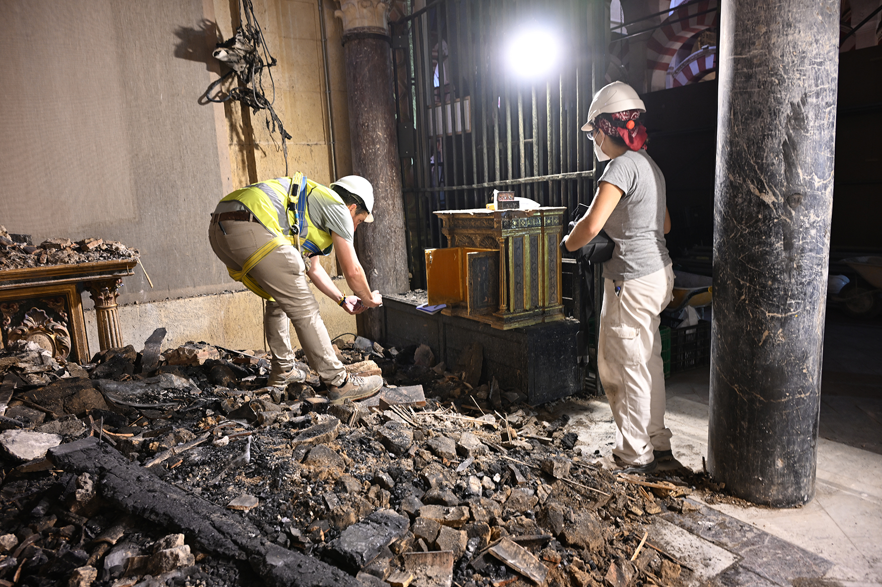 Operarios retiran el hollín restante en las bóvedas afectadas.