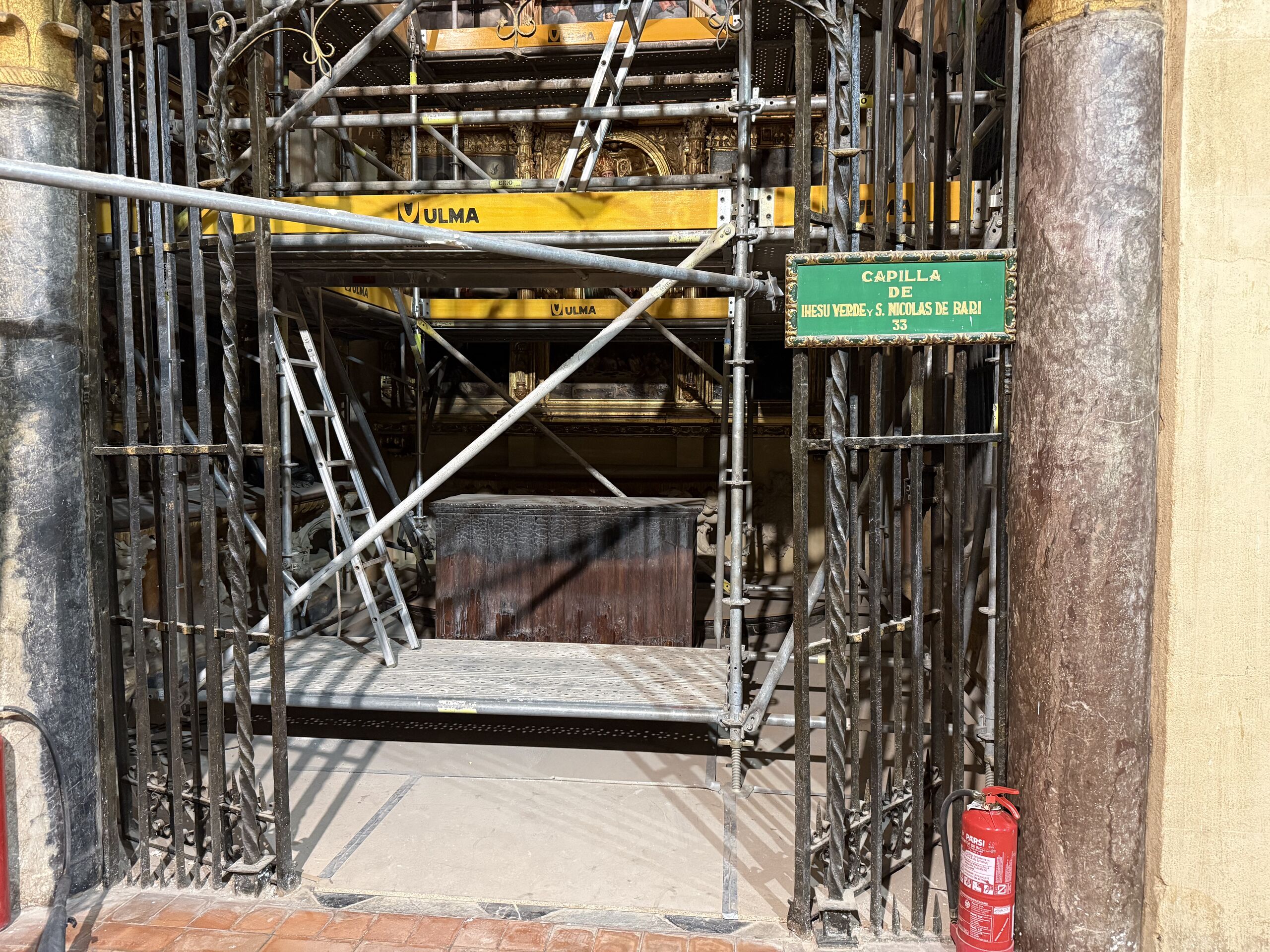 Al acercarse a la zona afectada por el fuego, la Puerta de San Nicolás, situada entre las capillas de San Nicolás de Bari y la de Nuestra Señora de la O, también conocida como la de la Expectación, aún se percibe un ligero olor a quemado. Una sucesión de andamios que sube hasta las cubiertas, lo más afectado por el incendio, oculta las capillas. Una estructura de madera sujeta una de las columnas "de caliza micrítica de aquí de la Sierra, una roca metamórfica muy dura, más que el mármol" que los técnicos están valorando si sustituir al haber quedado dañada.