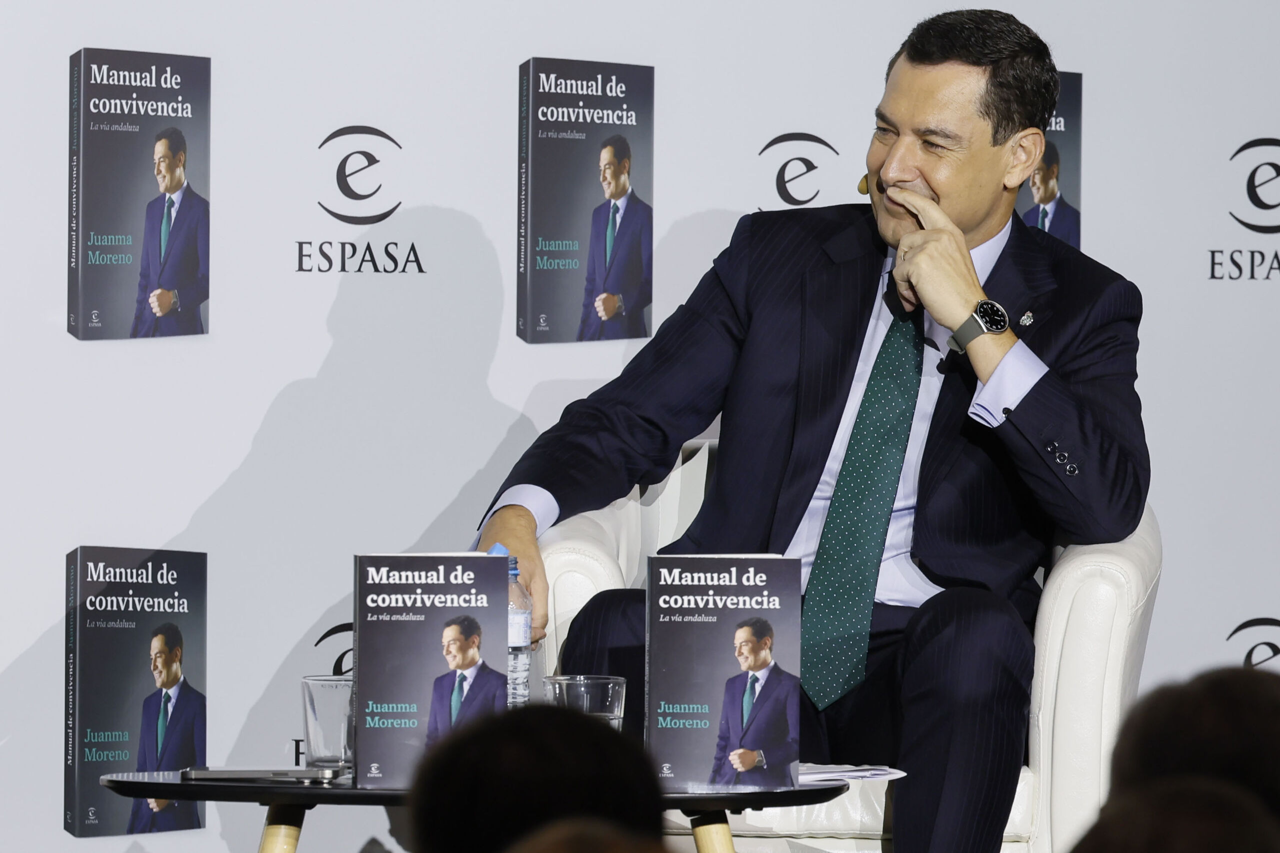 El presidente de Andalucía, Juanma Moreno, ha realizado este lunes un amplio repaso tanto por su vida política —pasada, presente y futura— como en su vida personal en la presentación de su libro Manual de Convivencia (Espasa), que ha tenido lugar en la recientemente remodelada Real Fábrica de Artillería de Sevilla. Allí, se ha mostrado convencido de mantener la mayoría absoluta después de los comicios autonómicos programados para junio de 2026 y ha contado una emotiva anécdota con su padre cuando este estaba enfermo de cáncer.