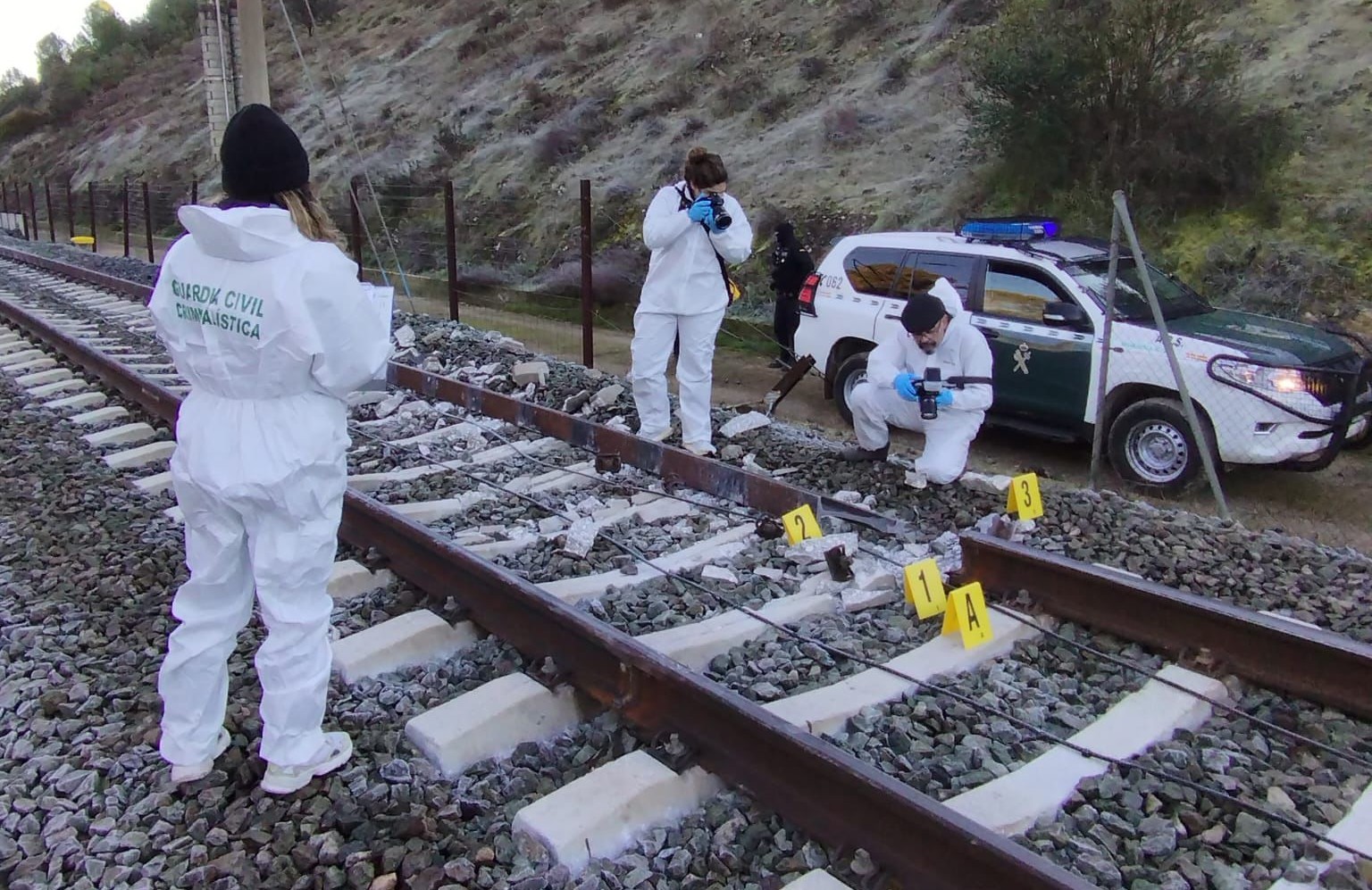 Los trabajos de la Guardia Civil en las primeras horas del día tras la tragedia de Adamuz