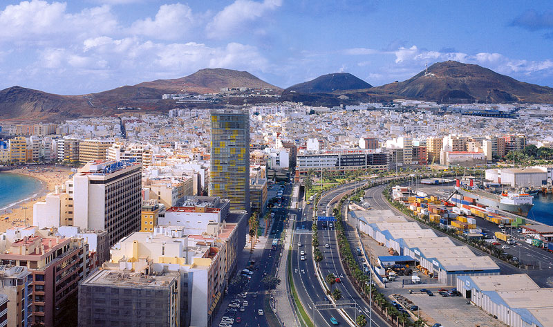 Las Palmas de Gran Canaria es, con cerca de 400.000 habitantes, la ciudad más grande y poblada del archipiélago. Su puerto es muy activo, así como el sector turístico. Las Palmas cuenta con una playa urbana, la de las canteras, muy concurrida y bien acompañada de hoteles. Edificios como el Woermann, en la imagen, son la carta de presentación de la nueva ciudad que mira al siglo XXI.