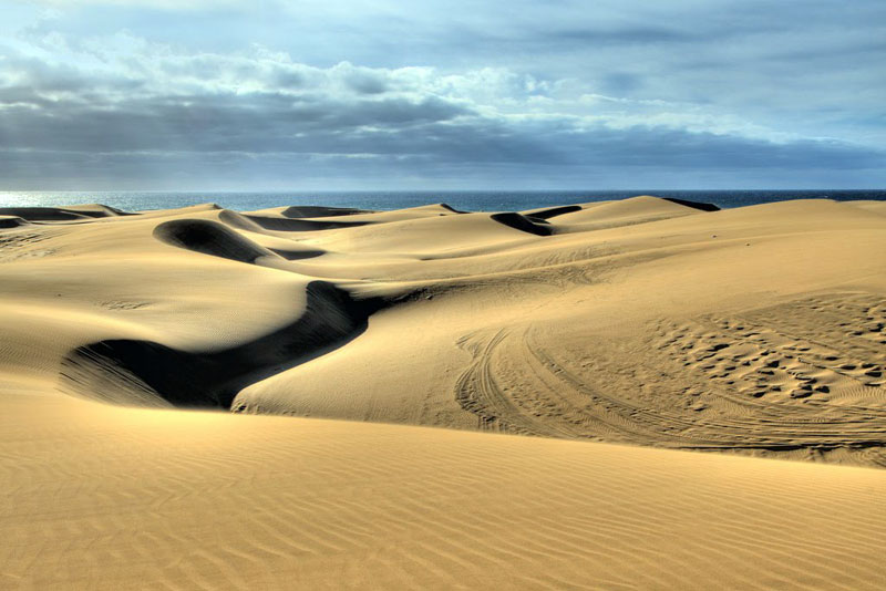 Las dunas de Maspalomas se encuentran al sur de la isla de Gran Canaria. Su aspecto, modelado por la cercana brisa marina, está en continuo cambio y acerca el paisaje canario al del vecino desierto del Sáhara. Cerca de las dunas se encuentra el principal núcleo turístico de la isla.