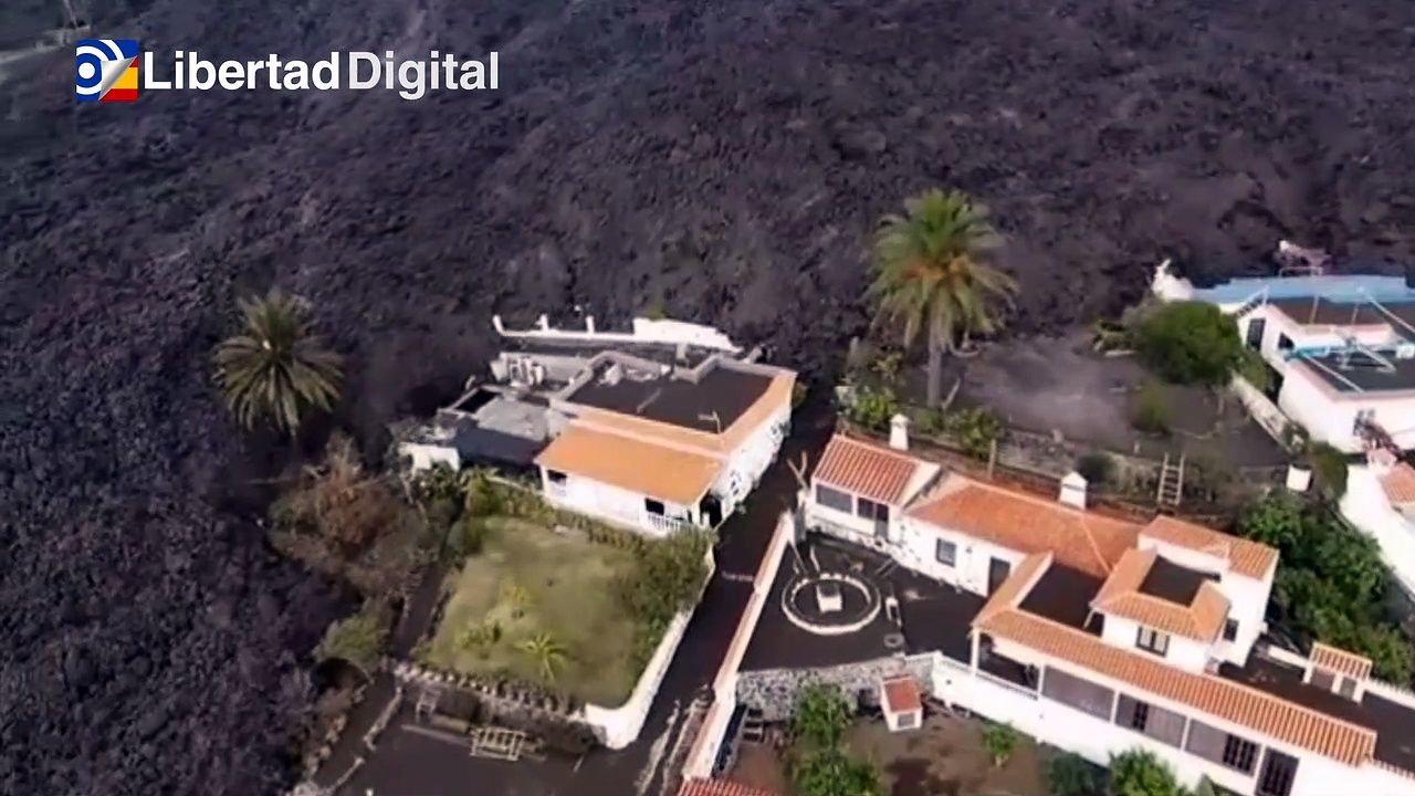 En este río de destrucción es posible divisar una suerte de milagros aislados que destacan sobre la negrura. Especialmente llamativo es el caso de una vivienda de color azul. A las 9 de la mañana de ayer aparece rodeada y en la trayectoria de la lava. Parecía que sería engullida sin remedio, pero hoy la encontramos aún en pie, flanqueada de muros ardientes y con otra zona intacta en su trasera. Impresiona aún más si observamos el panorama desolado que se extiende ladera abajo. A su izquierda apreciamos un núcleo de viviendas también ilesas. Están justo en medio de la bifurcación de la colada. La duda es saber si ya están a salvo o si esa masa de lava continuará avanzando hacia ellas. Una disyuntiva que vale también para esta otra zona amenazada por la vanguardia de la colada que se observa en la derecha de la pantalla. Hay casos en los que el desastre pasa, literalmente, rozando. Le ocurre a esta vivienda. Ya ayer la observamos con la lava pegada, en serio peligro. Hoy está exactamente igual. No hay daños visibles desde el exterior. Pero tanto esta como el resto de viviendas han sufrido en los cimientos y en la estructura los estragos de la lava. Son símbolos de resistencia que difícilmente volverán a ser habitables.